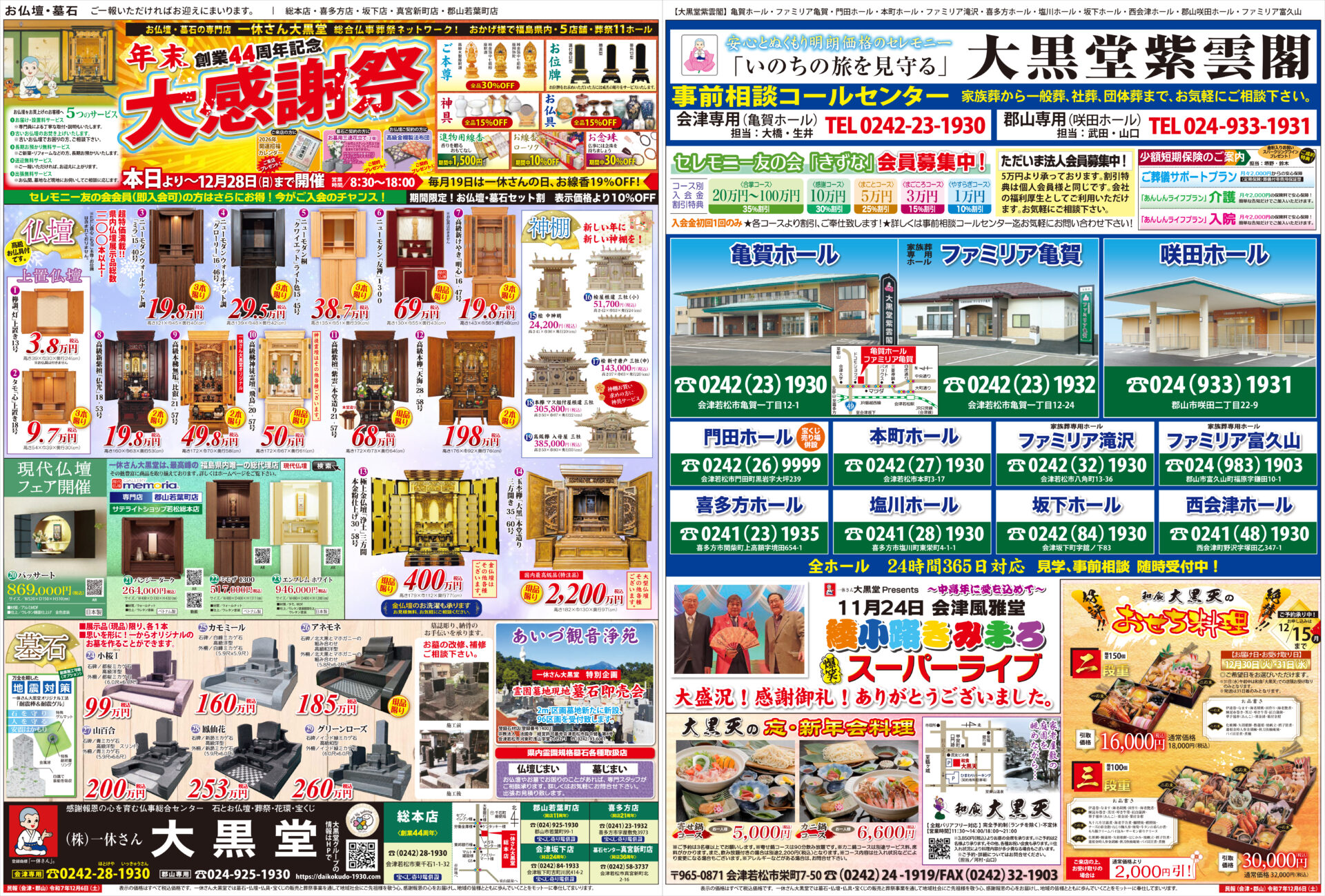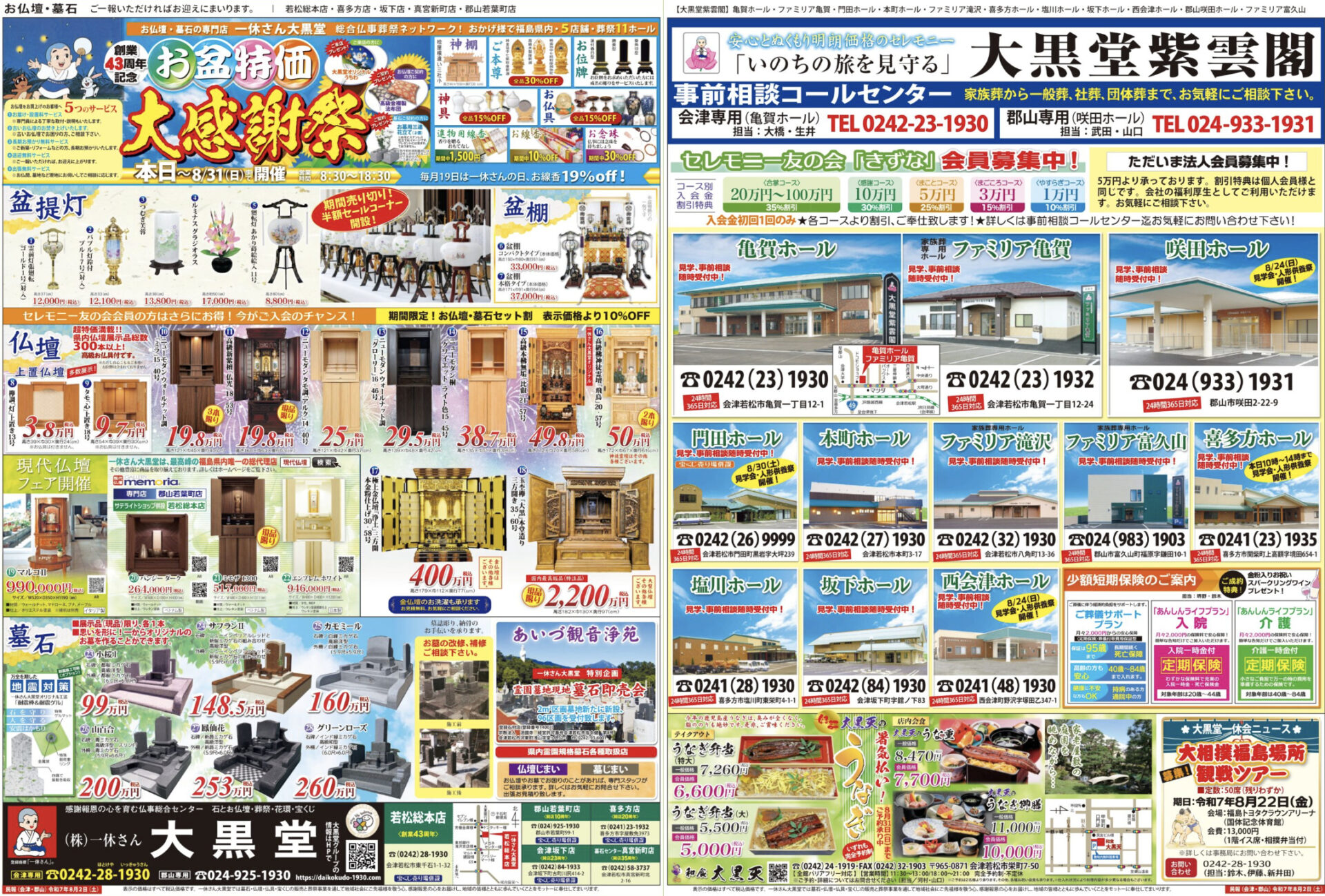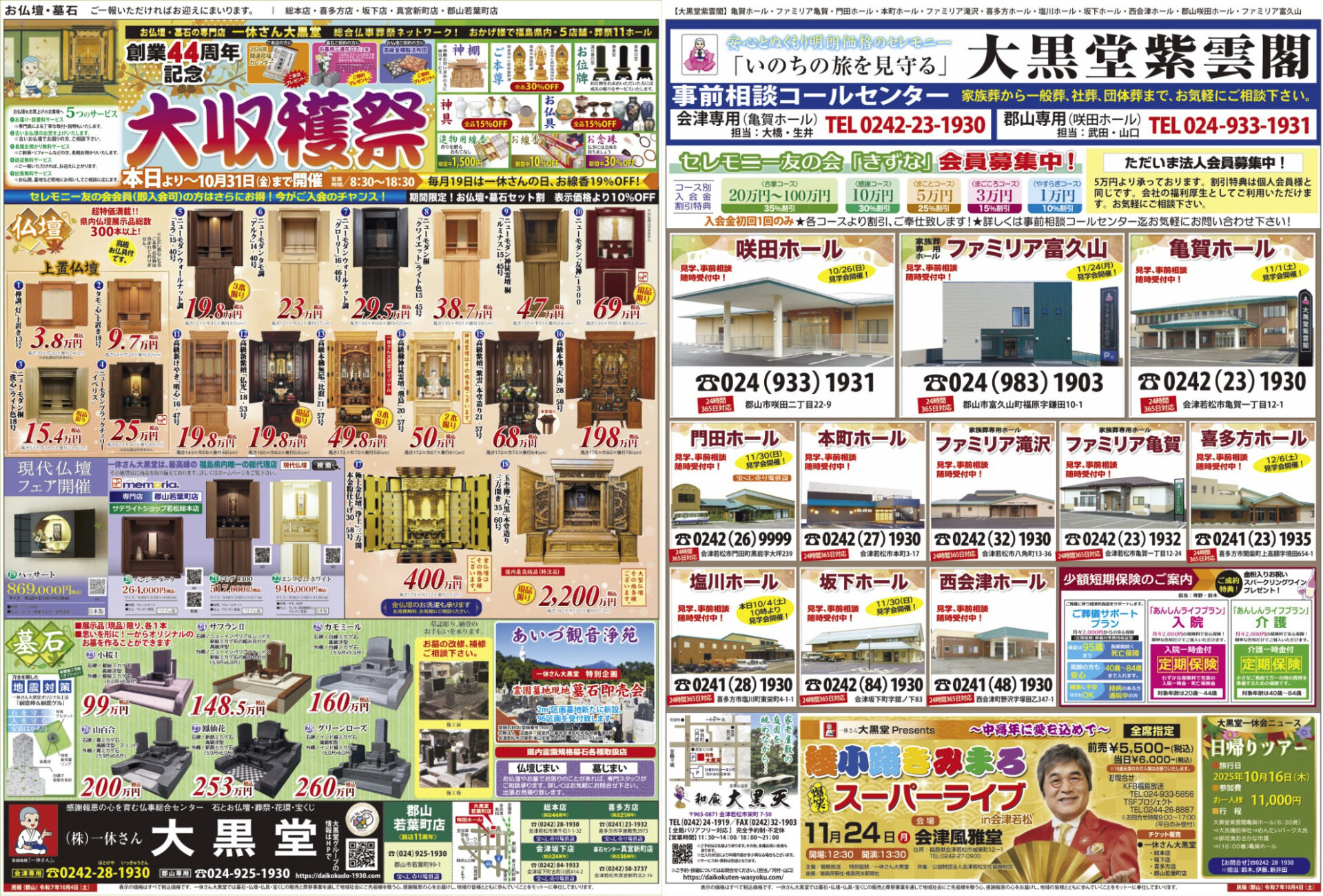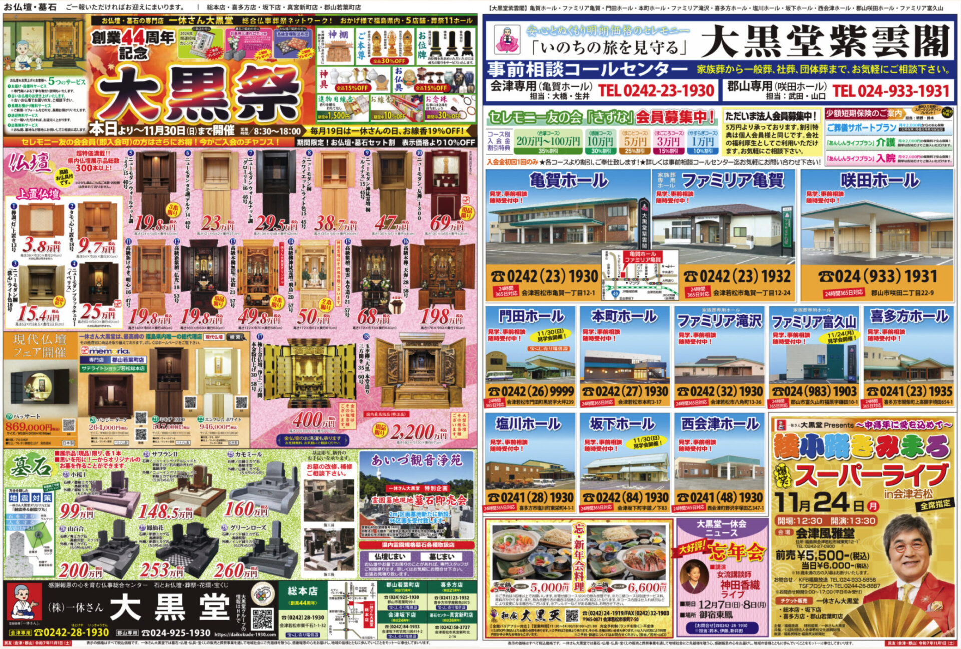 現在、福島県内一円で仏壇・墓石の販売を主とするご供養事業5店舗、葬祭のお見送り事業を担う大黒堂紫雲閣が11ホール、さらに各店舗、ホールに併設した宝くじ販売の開運お手伝い事業を展開しております。