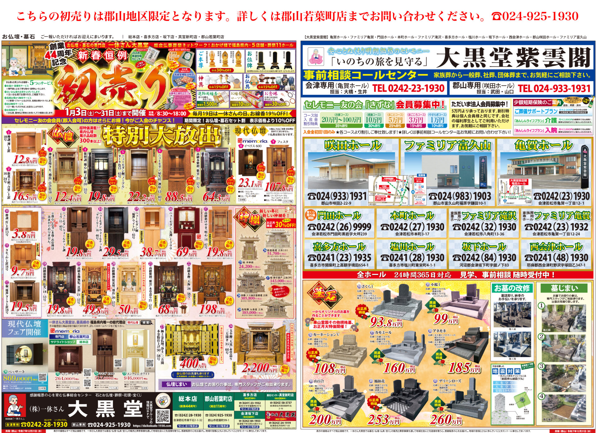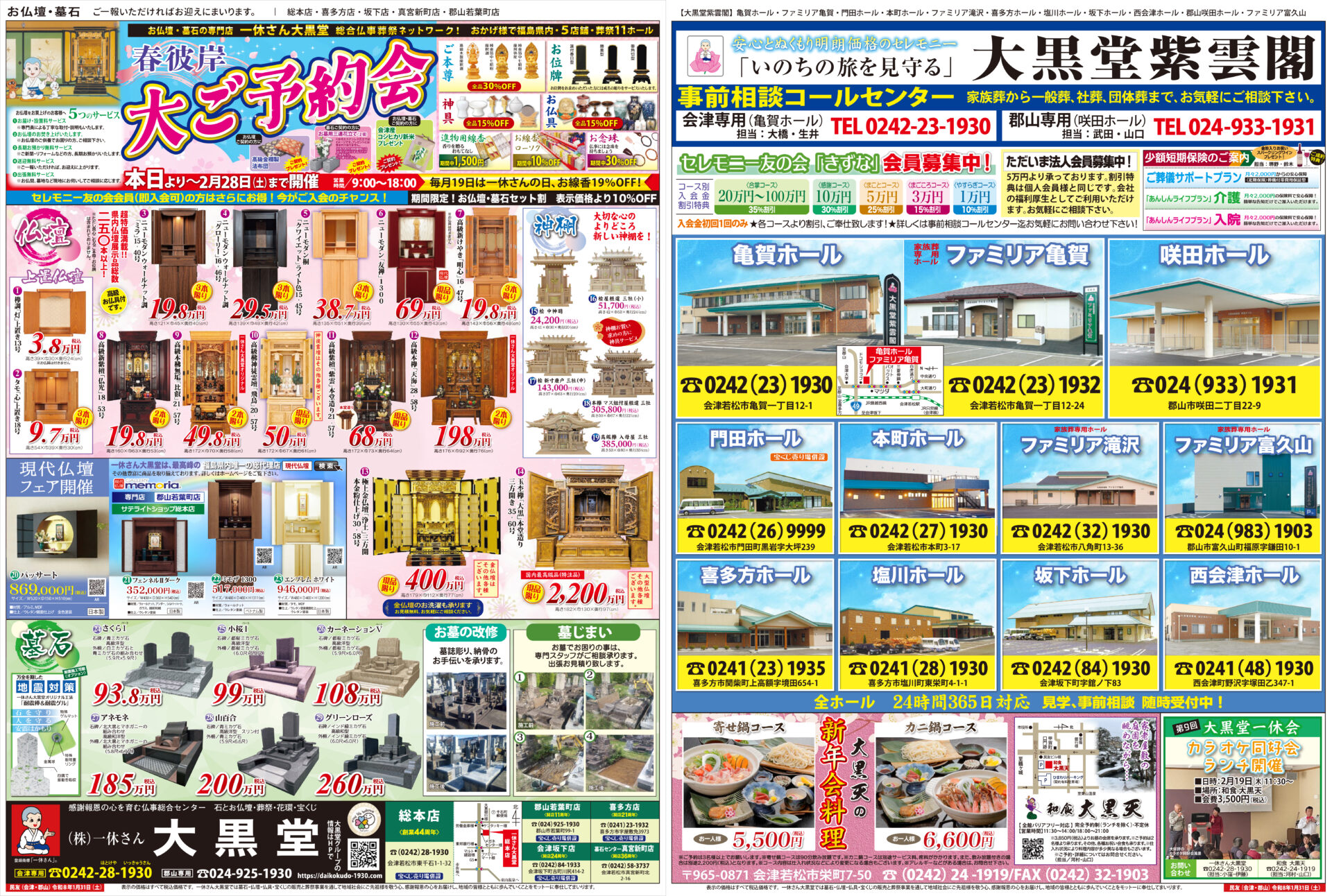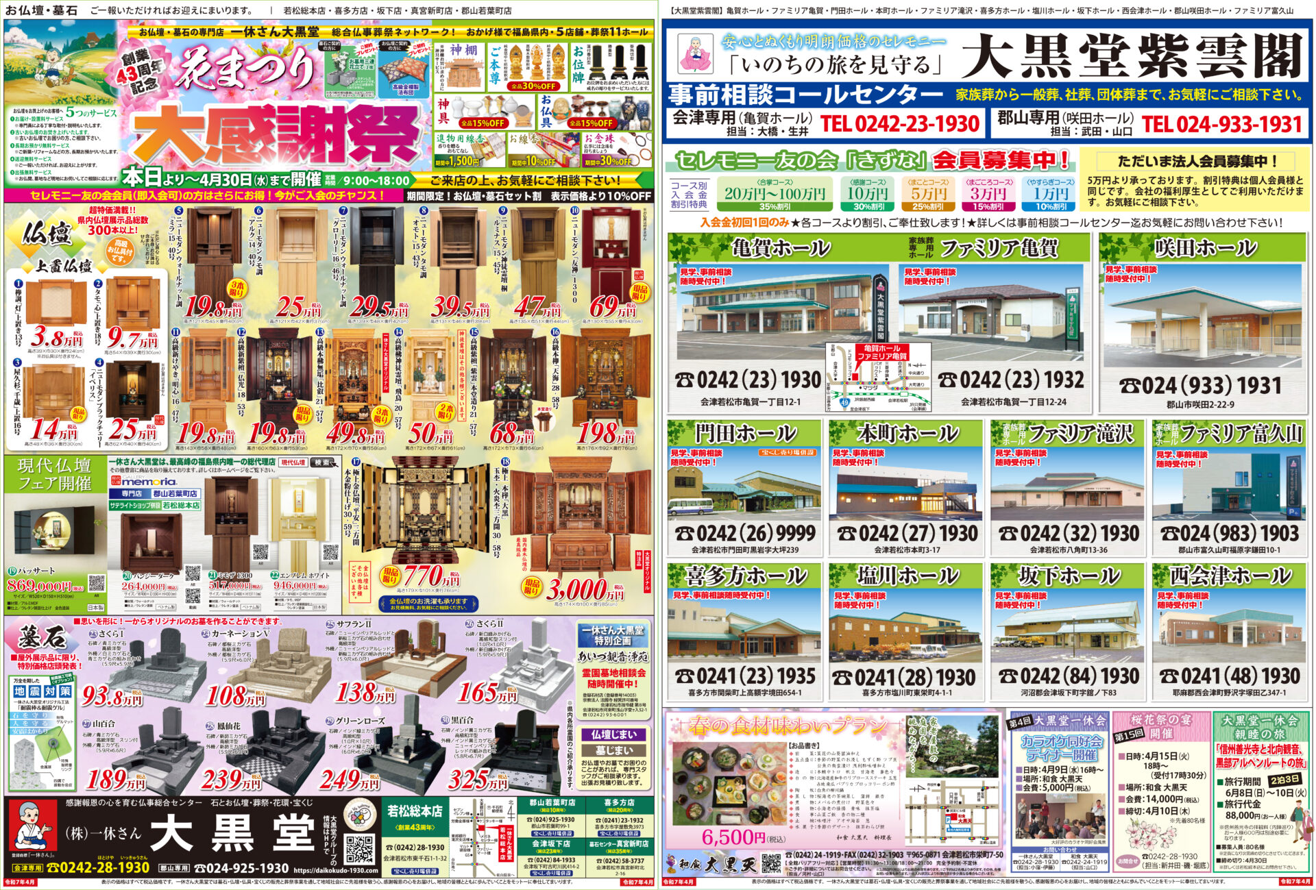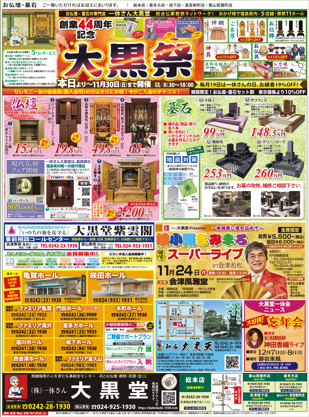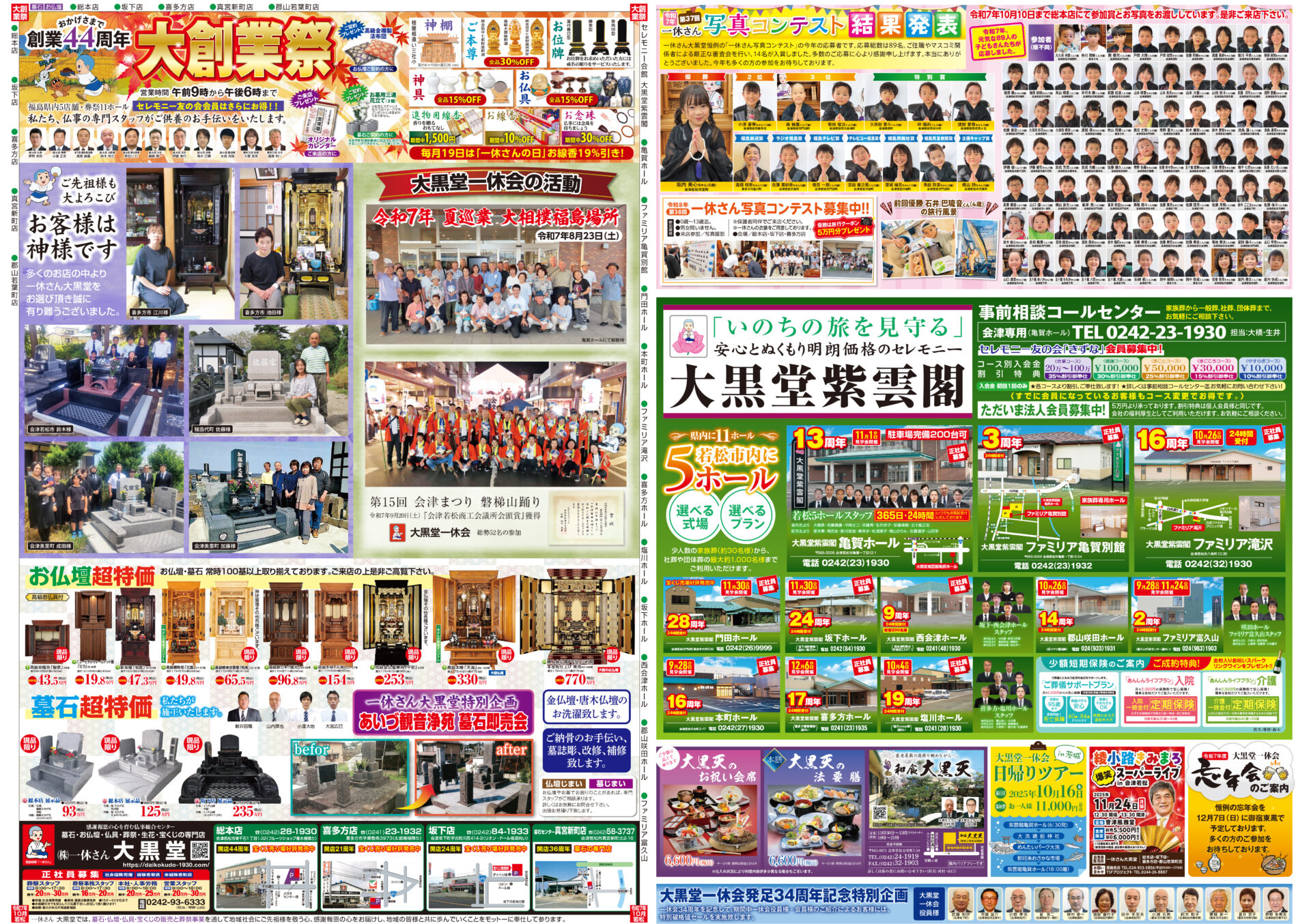 現在、福島県内一円で仏壇・墓石の販売を主とするご供養事業5店舗、葬祭のお見送り事業を担う大黒堂紫雲閣が11ホール、さらに各店舗、ホールに併設した宝くじ販売の開運お手伝い事業を展開しております。