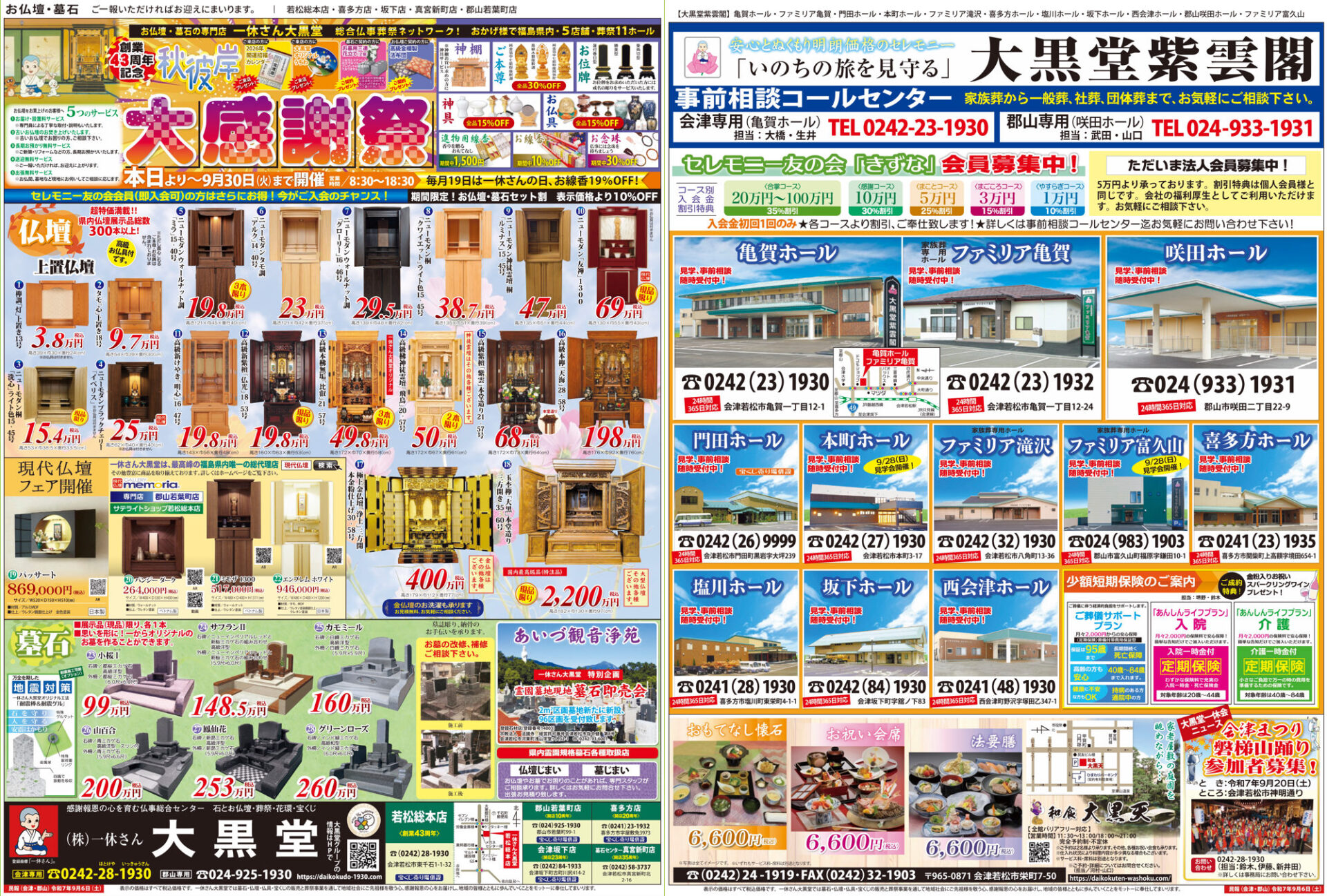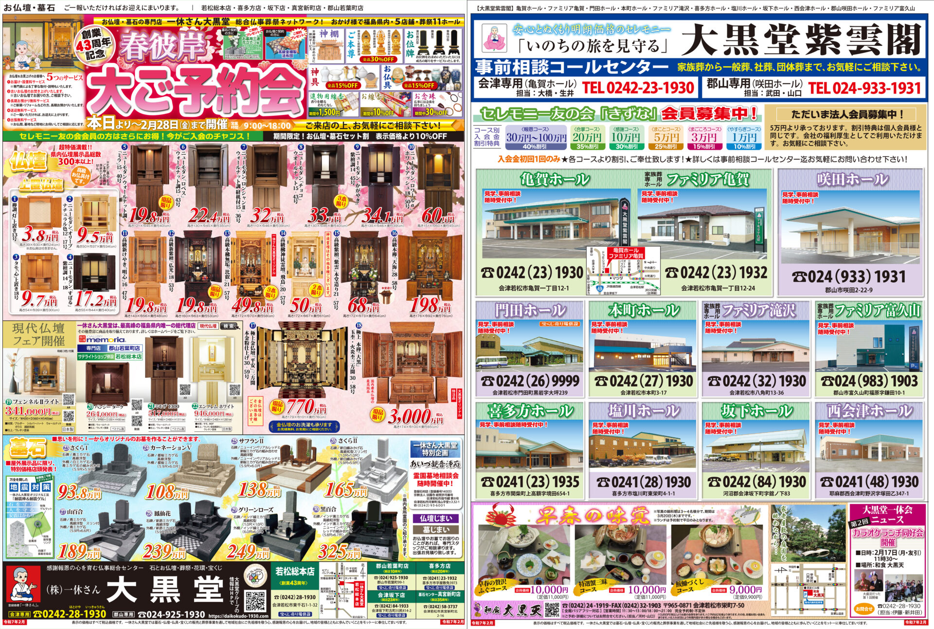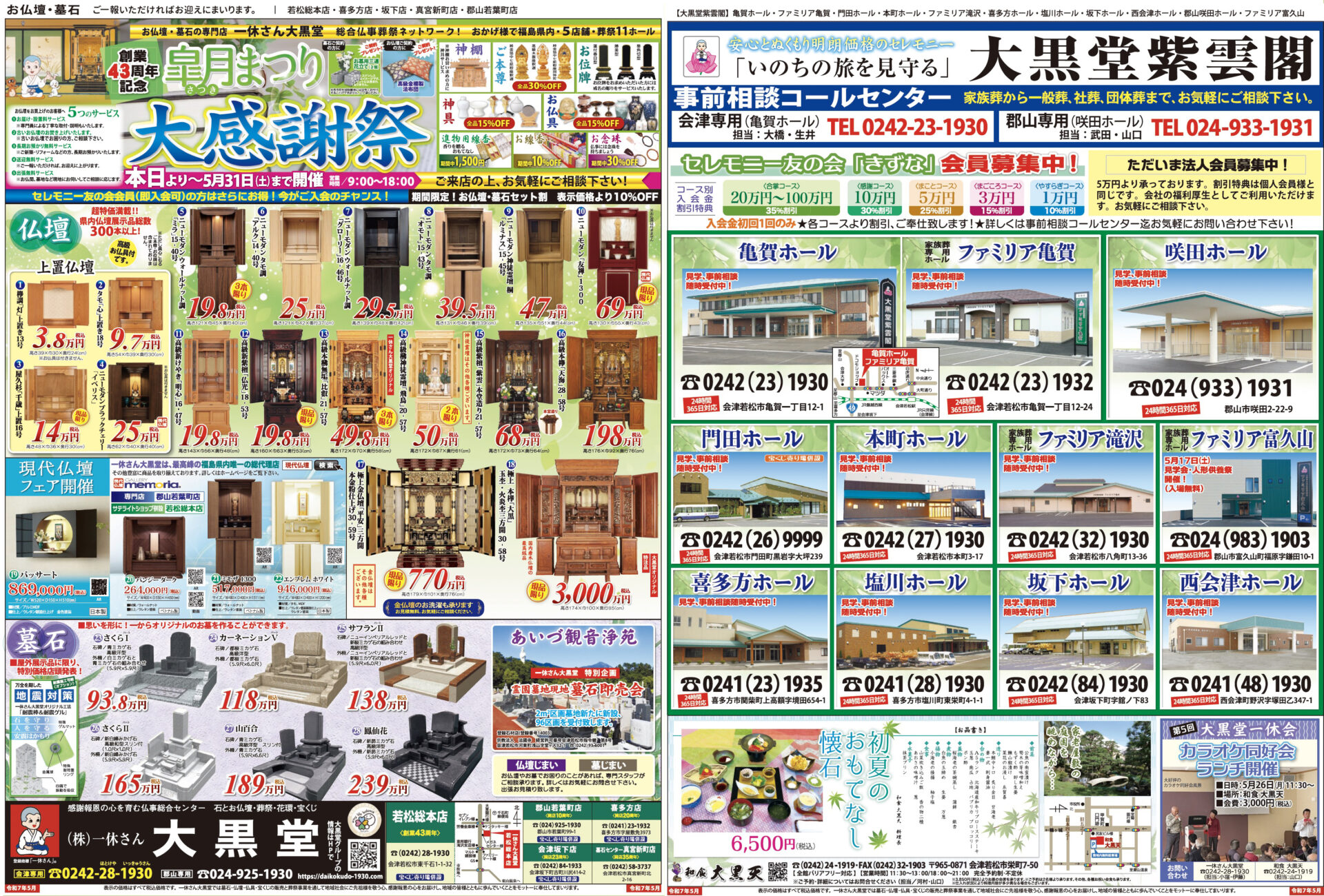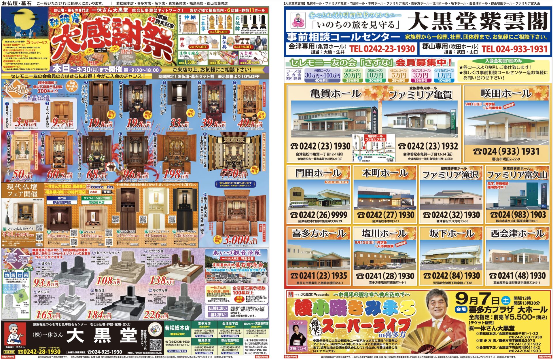 現在、福島県内一円で仏壇・墓石の販売を主とするご供養事業5店舗、葬祭のお見送り事業を担う大黒堂紫雲閣が11ホール、さらに各店舗、ホールに併設した宝くじ販売の開運お手伝い事業を展開しております。