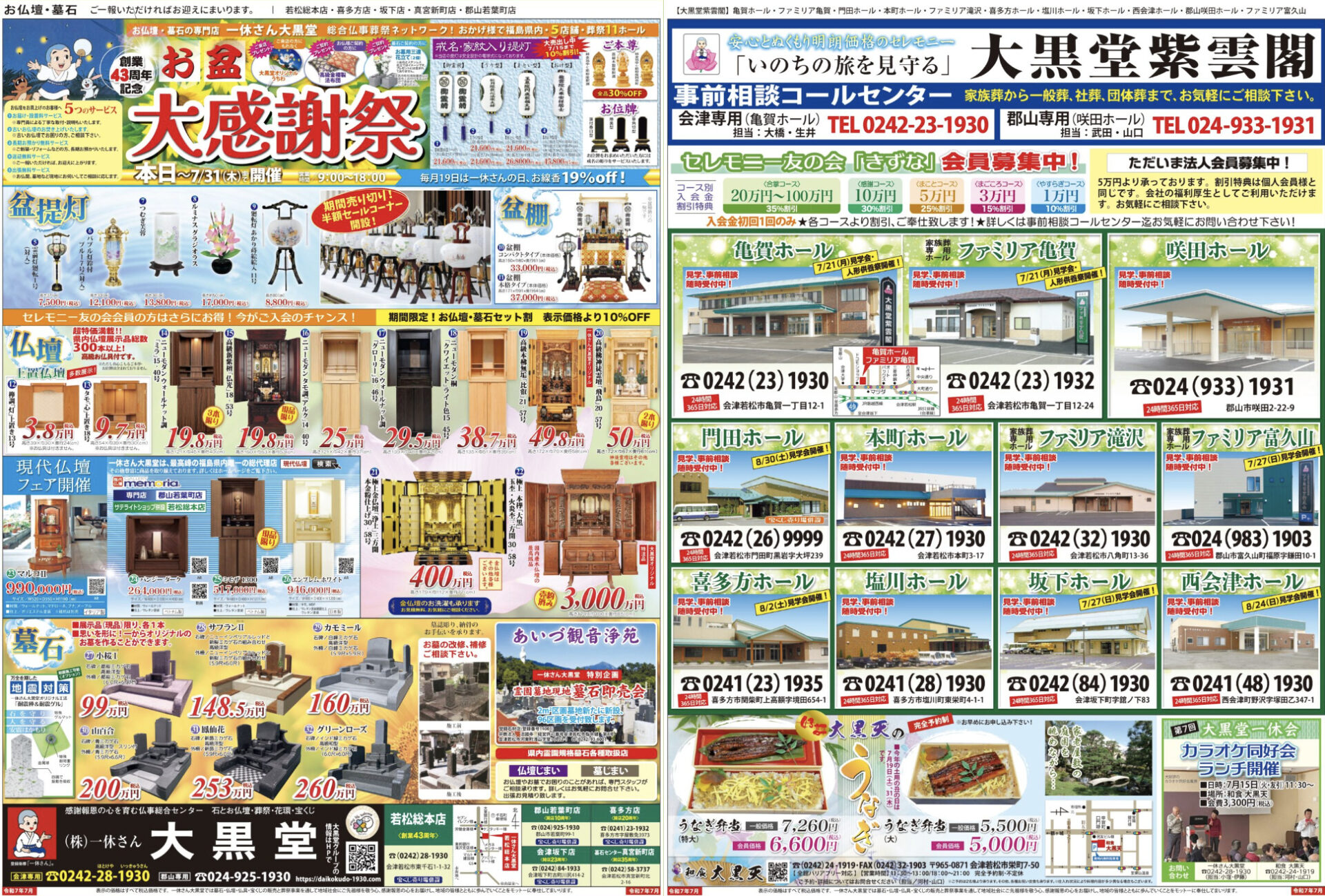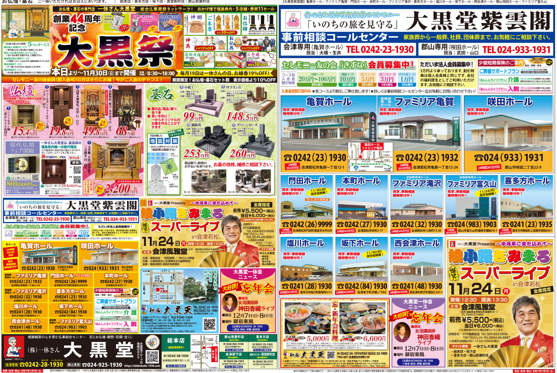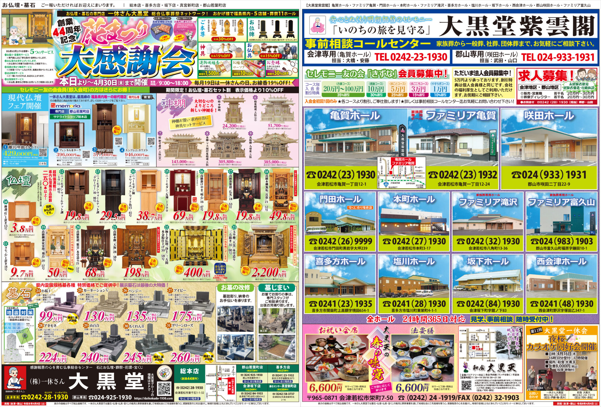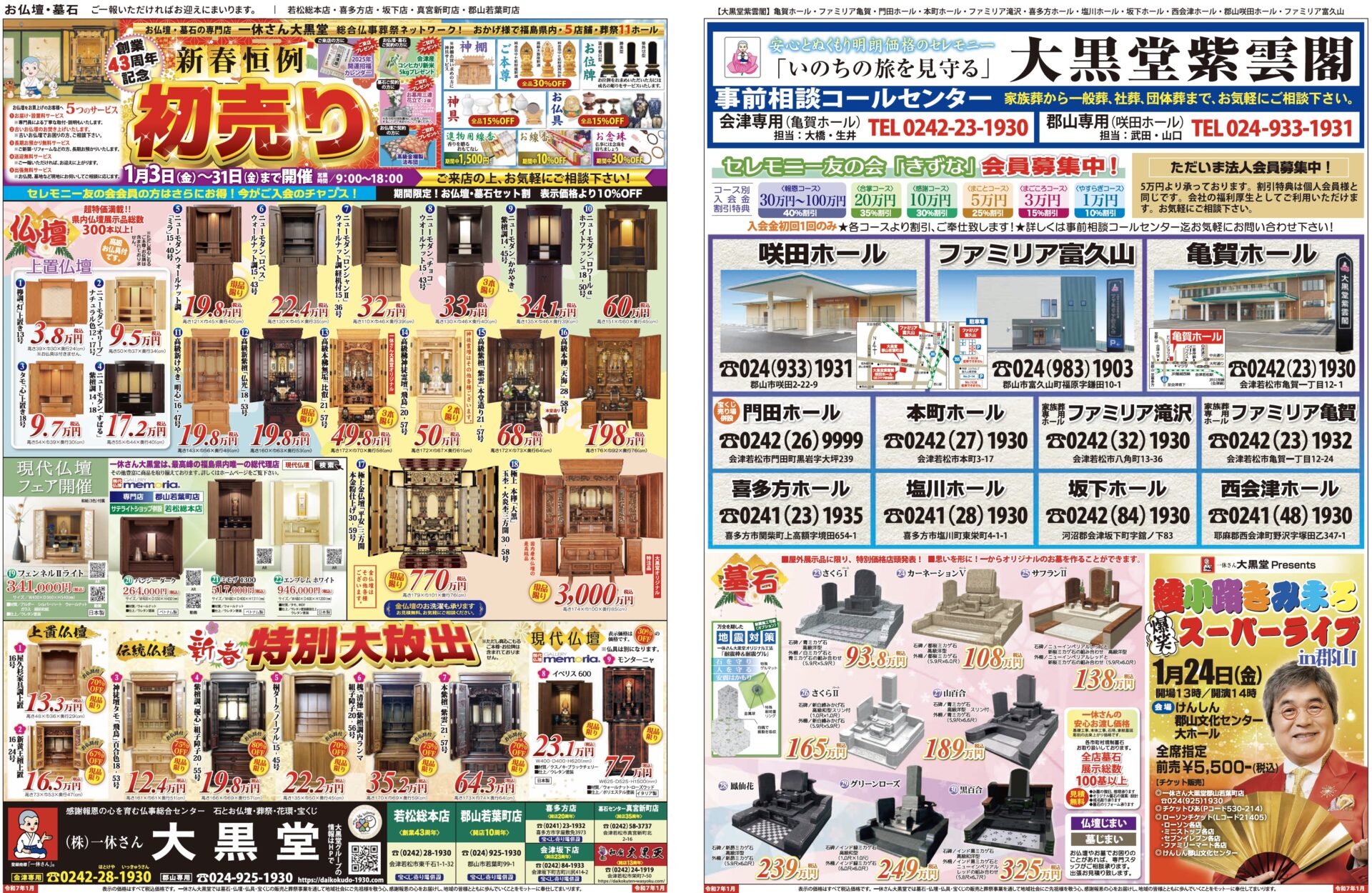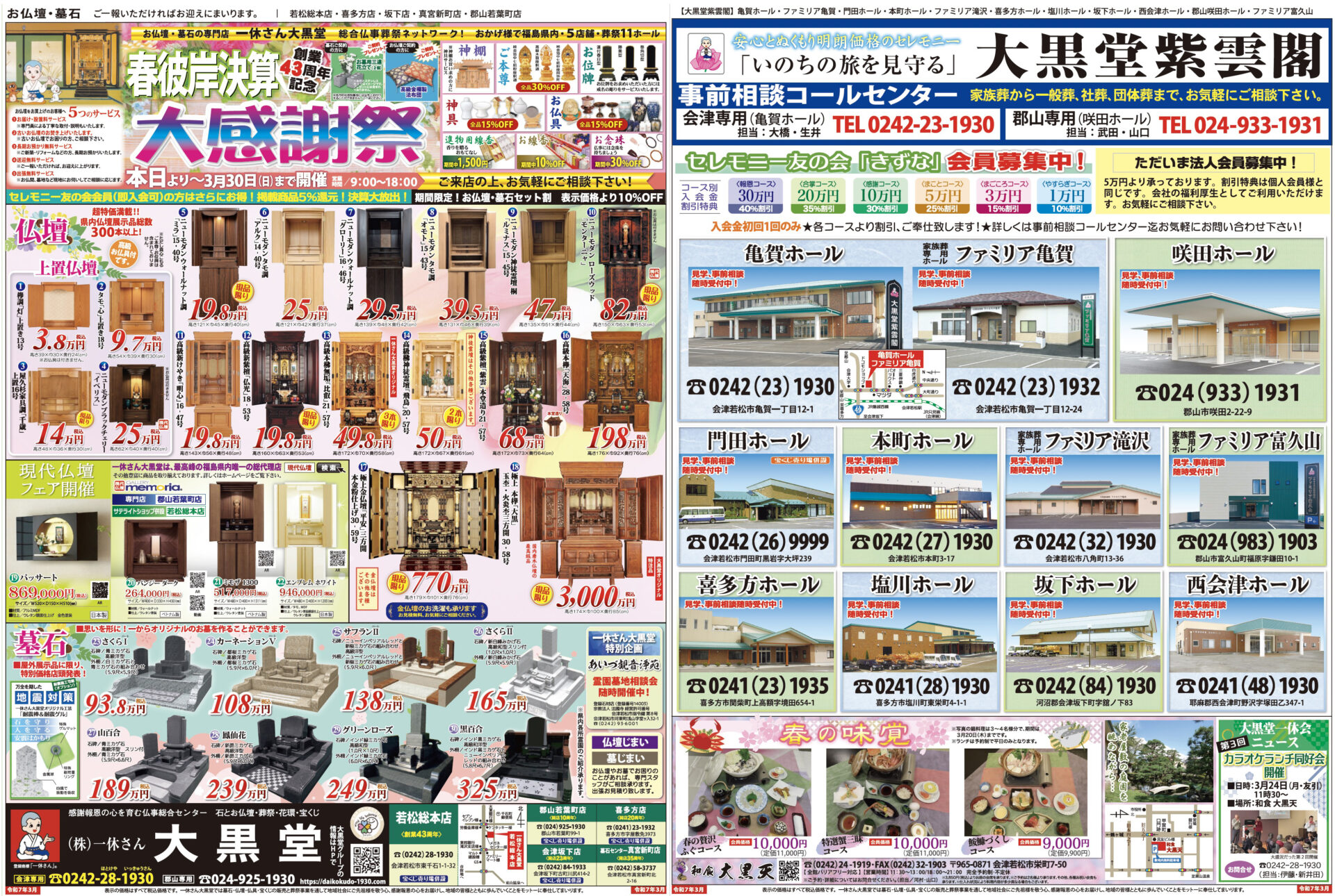 現在、福島県内一円で仏壇・墓石の販売を主とするご供養事業5店舗、葬祭のお見送り事業を担う大黒堂紫雲閣が11ホール、さらに各店舗、ホールに併設した宝くじ販売の開運お手伝い事業を展開しております。