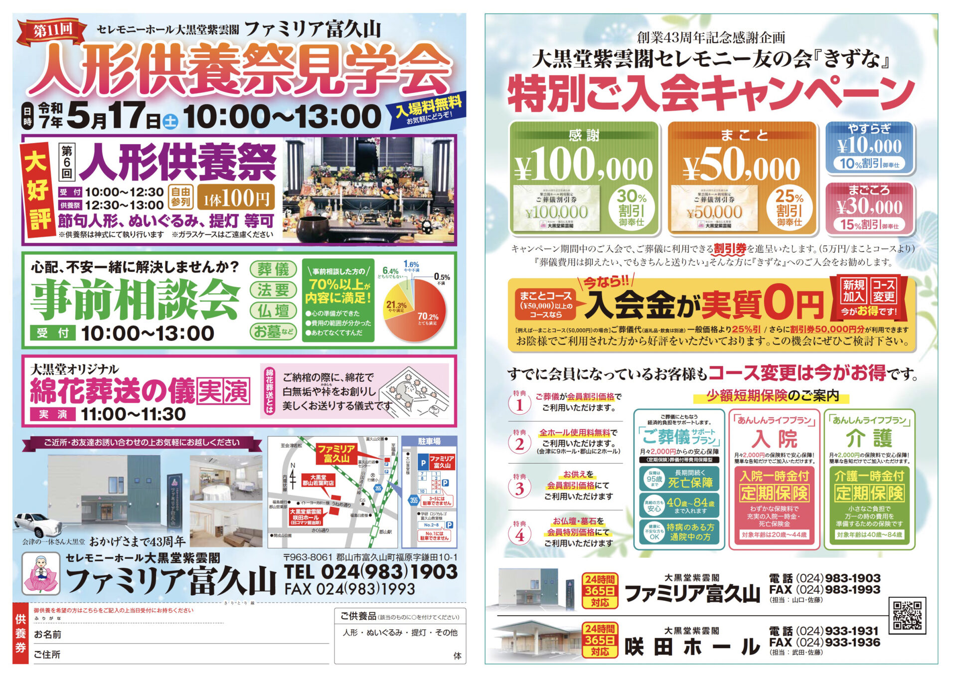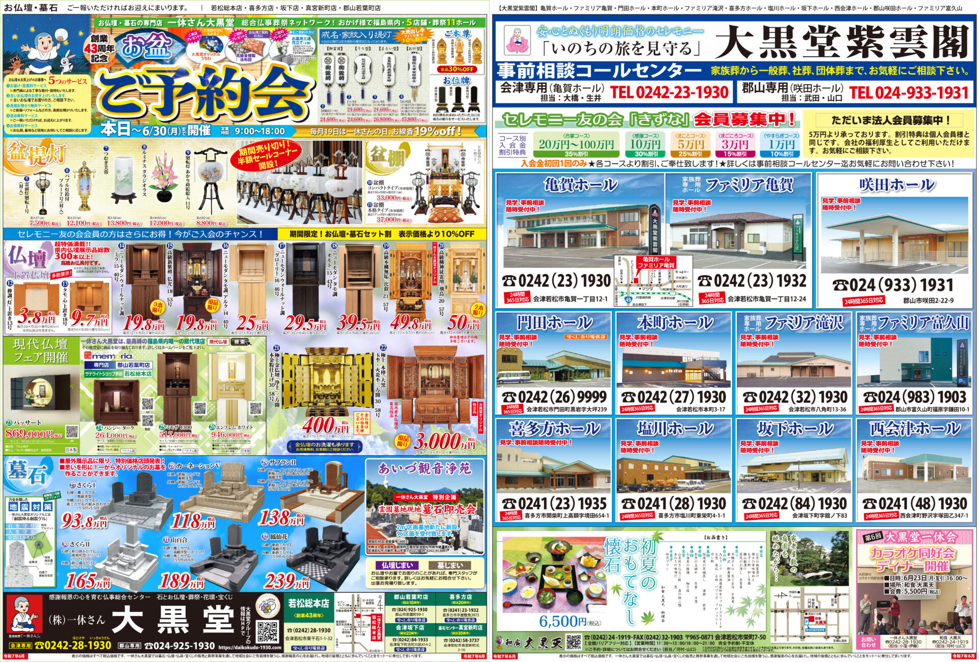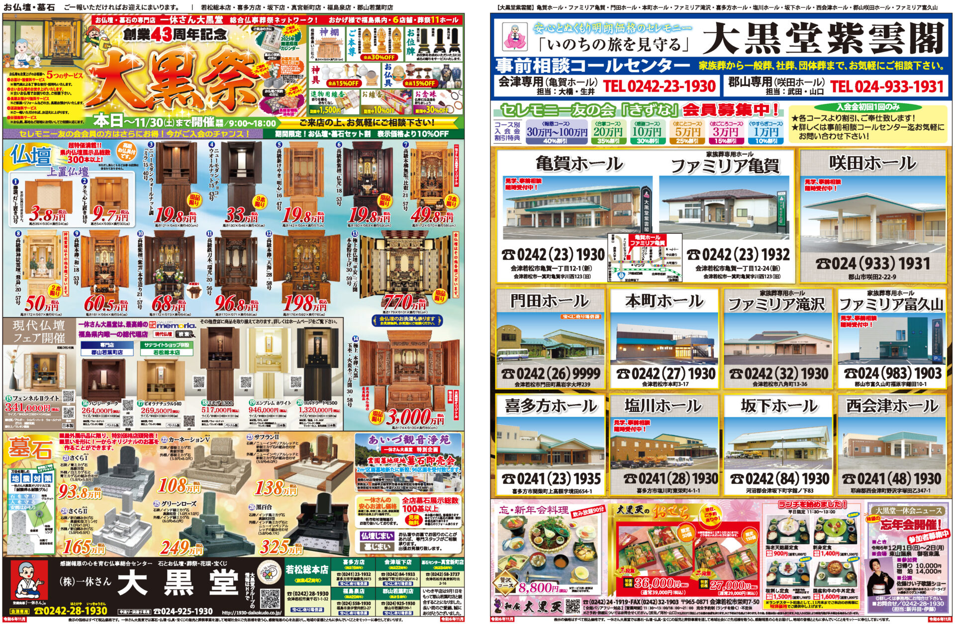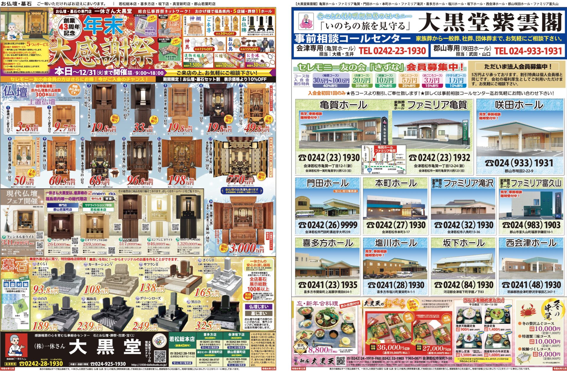 現在、福島県内一円で仏壇・墓石の販売を主とするご供養事業5店舗、葬祭のお見送り事業を担う大黒堂紫雲閣が11ホール、さらに各店舗、ホールに併設した宝くじ販売の開運お手伝い事業を展開しております。